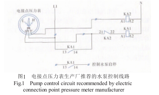 給水系統中的定壓系統是保持管網壓力恒定在一 定的范圍內當管網壓力低于某值時啟動水泵加壓, 當管網壓力達到一定值時停泵如此循環。實現此功 能的測壓元件是電接點壓力表。電接點壓力表一般由 導壓系統包括接頭、洋簧管等)、齒輪傳動機構、示 數裝置包括指針與度盤)、電接點裝置、外殼包括 表殼、表蓋、密封墊圈、表玻璃等)、設定裝置和接線 插頭座等組成,外殼一般為氣密型結構。其集壓力顯 示與控制于一起,設定調整方便。但電接點壓力表應 用在管網定壓系統中,下述問題不可避免會遇到,設 計控制線路時如不采取一定措施,無法保證安全、穩 定運行。一般設計的水泵控制線路如圖1所示。但應用 到管網定壓系統時會存在以下問題。