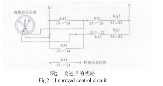 為了克服上述缺點,可按圖2修改原理圖。在接點 b- c間增加閉鎖接點,一旦電接點壓力表指針碰上高 位接點,KA2中間繼電器立即閉鎖,消除了接點b-c 的抖動。同時為了能保證管網壓力到達低限時a-b 點能啟泵,將KA1的常開接點串入本回路,見圖2 修改后的接線可以很好地消除管網壓力升至上限值 時,接點b-c抖動而引起的接觸器跳躍現象。此接線 己在幾個工程運行數年,實踐證明很可靠。