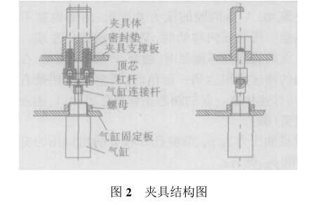 裝夾工件為雙針壓力表底座(如圖1b所示),檢測(cè) 氣體從壓力表底座的兩螺紋接口中心孔通入,其夾具 結(jié)構(gòu)如圖2所示,將雙針壓力表底座螺紋部分裝入夾 具體,當(dāng)夾緊氣缸缸桿伸出,通過(guò)氣缸連接軸、缸桿,推 動(dòng)兩頂芯向上運(yùn)動(dòng),直到壓力表底座螺紋端部壓緊密 封墊并夾緊工件。密封墊材料采用聚氨酯,以延長(zhǎng)其 使用壽命。夾具體與雙針壓力表底座螺紋配合部分尺寸應(yīng)基本一致,以防止夾緊時(shí)夾緊力為單邊作用力使 工件傾斜導(dǎo)致密封效果差的問(wèn)題。檢測(cè)氣體從頂芯的 兩中心孔分別進(jìn)入到壓力表底座的兩螺紋接口的中心 孔以實(shí)現(xiàn)壓力表密封性檢測(cè)。當(dāng)夾緊氣缸缸桿返回時(shí),工件松開(kāi)。