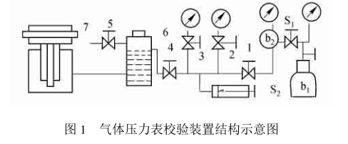 檢定壓力表的示值,按照JJ G49 一1999《彈簧管 式精密表和真空表》國家檢定規程的要求:“測量上 限值不大于0. 25MPa的精度表,工作介質為清潔的 空氣或無毒、無害和化學性能穩定的氣體,測量上限 值不大于2. 5MPa實際是用于測量氣體壓力的精密 表,檢定時也用氣體作工作介質”我們發現,在實 際使用中,如果精密表是用來測量氣體壓力,而檢定 時卻用液體作工作介質,由于兩者介質之間密度差 異較大,將會帶來附加的誤差。實驗證明,上限值為 1. 6MPa,0. 4級的精密表,用空氣與變壓器油作介 質進行示值檢定時,空氣檢定的示值普遍要比變壓 器油檢定的示值大,其最大差值有時接近于儀表的 允差。而且壓力表的量程越小,兩種介質的示值差 對于滿刻度的百分數就越大,量程越大,這個百分數 值就越小。對此,我們用油壓式活塞式壓力計校驗 器進行改動,制作測量氣體壓力在4MPa的氣控壓 力表檢定裝置,經使用多年,效果很好,現介紹如下。