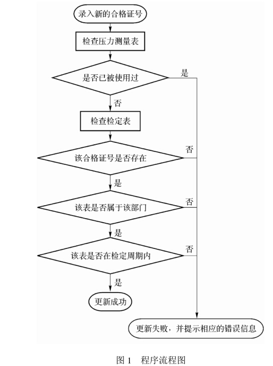 在以往的管理中,常有發現臺賬數據與現場實際 情況不一致,也即假臺賬現象。為了杜絕此現象,就 要在車間更新壓力測量表中的合格證號時在程序上對其進行多項驗證,實現方法見程序流程圖(圖1)。