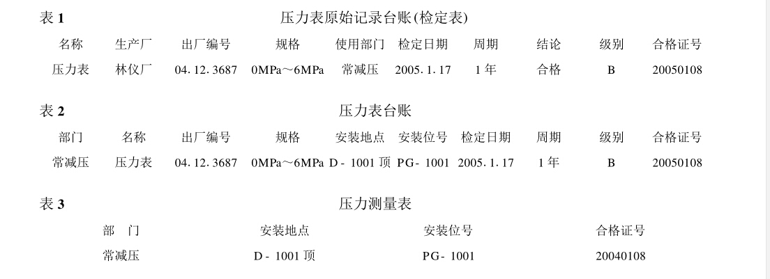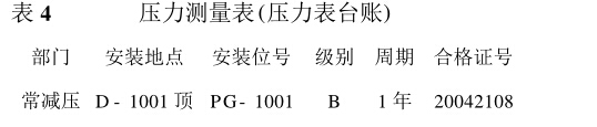 因壓力表原始記錄臺賬上一個合格證號對應一 塊壓力表,在更新合格證號的同時,壓力表出廠編號 也隨之自動更新。這樣計量管理人員只需根據壓力 表臺賬對現場壓力表安裝情況進行抽查,如發現合 格證號、出廠編號與臺賬數據不一致,即可要求該單 位立即整改,從而避免了將新檢定的壓力表合格證 號撕下貼于舊表上而不真的進行更換的現象。