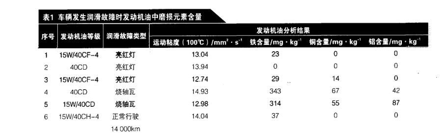 部分國內車輛設計者未從過去依 靠粘度保證潤滑的觀念上轉變過來, 將最小發動機油壓力設計得太高,使 發動機油壓力表在仍能很好潤滑的情 況下也亮紅燈。筆者曾通過測定車輛 發生潤滑故障時發動機油中磨損元素 (FeCuPb )含量的變化對這一情 況進行跟蹤,分析數據見表1。