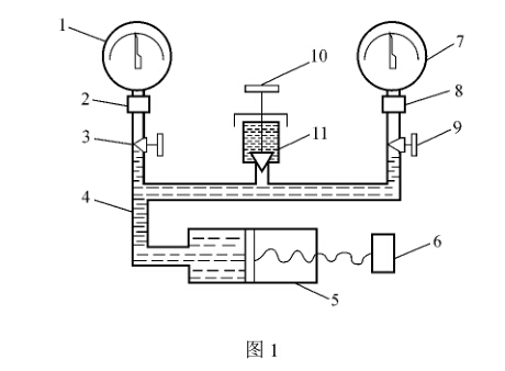 壓力表校準要使用壓力表校驗臺,現在普通使 用的壓力表校驗臺的結構原理如圖1所示’圖中1 為標準壓力表,2、為壓力表接頭,3、為針閥,4 油管路’ 5為加壓泵’ 6為手輪’ 7為被校壓力表’ 10 為油杯閥,11為油杯。