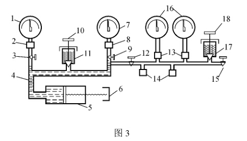 截止閥6用于對其他延伸部分的再連接。力口入延 伸部分后的整體外形如圖3所示,圖中1為標準壓力 ,2、、34為壓力表接頭,3、、125為截止閥,716 為被校壓力表,4為油管路,5為加壓泵,6個手輪,10 18為油杯閥11為主油杯,17為輔助油杯。