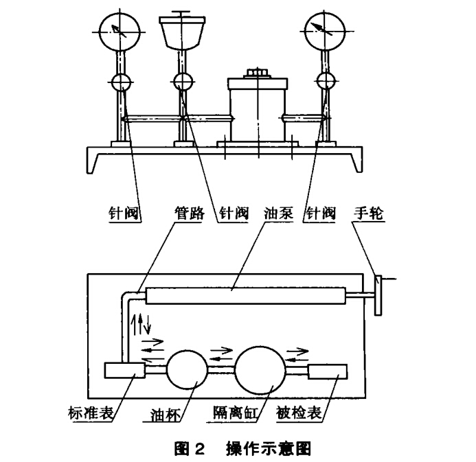 清除傳壓介質中的雜質有兩種方法:一是清洗被 檢表;二是切斷雜質的流路。第一種方法做起來很麻 煩,我們采用第二種方法。就是在校驗器的油杯和被 檢表之間的油路上加裝一個隔離缸。利用不同密度的 物體在液體中的浮力不同的原理,把密度大于傳壓介 質的機械雜質隔離在新裝的隔離缸中,切斷了雜質的 流路,起到保護閥和皮碗的作用。