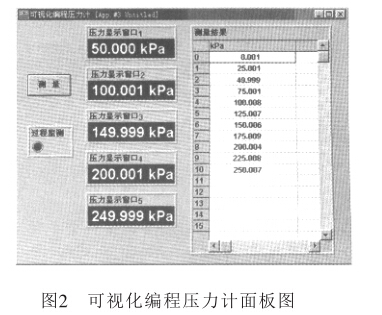 除此之外,還具有向其他應用程序 交付數據的功能。利用Windows的DDE (動態數據交換)功能,也可以向Microsoft 公司的應用軟件MS -word、MS-excel或 Matlab等軟件直接交付數據。用戶若能 熟練掌握編程方法,則無需用計算機語 言編程和手工方式裝入實驗數據,任何 人通過可視化編程非常方便地進行軟 件開發完成測量。可視化編程測量的壓 力計面板圖見圖2。