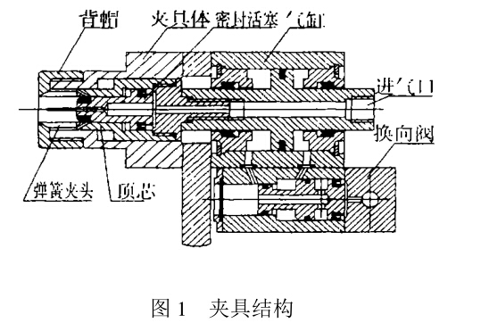 快速裝夾夾具采用氣缸快速推動彈簧夾頭夾緊 工件,用氣缸壓緊聚氨脂密封墊密封的方式實現裝 夾、密封,而從達到校驗工件的目的。其結構如圖1 所示。