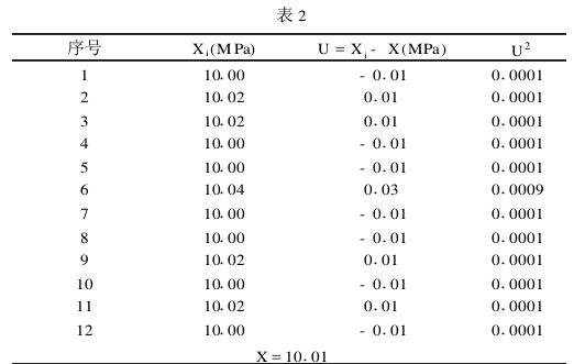 在環(huán)境條件:溫度:(20 ±5) 相對(duì)濕度:小于 85 %,等溫2h以上;環(huán)境壓力:大氣壓,測(cè)量方法:通過(guò)升 壓和降壓兩個(gè)循環(huán),將被測(cè)壓力表在10Mpa點(diǎn),與標(biāo)準(zhǔn) 表比較,逐點(diǎn)讀取被測(cè)壓力表示值,反復(fù)測(cè)量12次,各項(xiàng) 測(cè)值如表2所示。