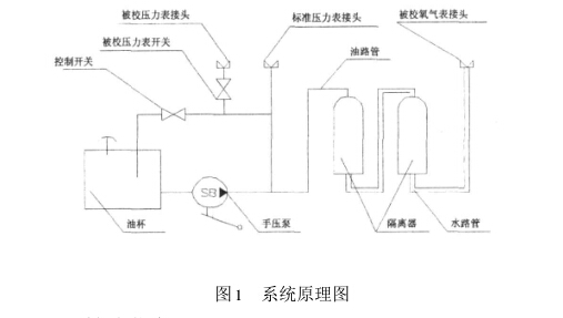 本裝置是根據(jù)帕斯卡定律,以流體靜力學(xué)的平衡原 理為基礎(chǔ)進(jìn)行壓力計(jì)量的。本裝置采用油水分離法,通 過(guò)兩級(jí)油水分離裝置,用精密壓力表作為標(biāo)準(zhǔn),來(lái)校驗(yàn)下 等級(jí)的壓力表和氧氣表。檢定時(shí),利用壓力校驗(yàn)器的手 動(dòng)柱塞泵造壓并通過(guò)油管路和水管路傳遞壓力(水管路中被校氧氣表接頭專作檢定氧氣表及其他禁油類壓力表 用,油管路中接頭作連接標(biāo)準(zhǔn)壓力表和被校壓力表用), 將該壓力同時(shí)傳遞給精密壓力表和被測(cè)壓力表,使二者 在同一壓力下進(jìn)行示值比對(duì)。系統(tǒng)原理圖見(jiàn)圖1。