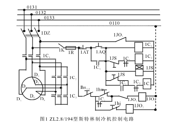 彈簧管式電接點壓力表作為指示、控制 儀表廣泛用于自動對壓力進行區間控制的場 。測量ZL2.8/194型斯特林制冷機四個缸平 均工作壓力的壓力表中,有一個YX-150型電 接點壓力表。利用表內上限可調電觸頭,控制 制冷機平均工作壓力的上限+值(2.7MPa) 常工作時,壓力表指針位于電觸點下面,當制 冷機因某種原因平均工作壓力超過額定值 時,壓力表指針與上限電觸頭相碰,電路接 通,通過控制電路切斷電機電源,制冷機停止 運轉[1]。圖1為制冷機控制電路原理圖。圖中, 交流接觸器型號是CJO-75TH 1JS型號為SJS-5的時間繼電器,1hs1—4表示4 只水量訊號裝置行程開關串聯在一起,1hu 表油壓訊號裝置行程開關,1hj表示電接點式 壓力表的電觸頭,1JOjD1JO2S兩個中間繼電 器,型號是JZ7-44TH