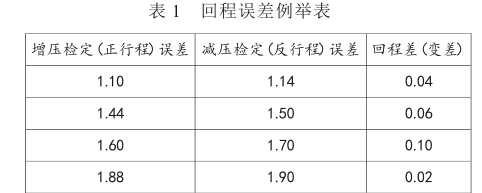 壓力表在計量檢定過程中,其增壓檢定(正行程)和 減壓檢定(反行程)所有示值各點時,輕敲表殼后,兩次 讀數(shù)之差稱為來回程差,也可稱之為壓力表的回程或反 行程誤差(如表1)。