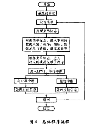 本系統(tǒng)采用分時數(shù)據(jù)采集的策略,即根據(jù)設(shè) 置的菜單情況,采集不同的數(shù)據(jù)信息,如壓力、溫 度及電池電壓等信息。以壓力數(shù)據(jù)采集為例,并 不是程序每循環(huán)一次進(jìn)行一次壓力數(shù)據(jù)采集,而 是根據(jù)時間信息來采集。本系統(tǒng)程序設(shè)計(jì)為每 0.U進(jìn)人一次時間中斷,在時間中斷中退出低功 耗模式3,進(jìn)人活動模式,程序循環(huán)執(zhí)行一次,然 后進(jìn)人低功耗模式3(LPM3)。同時,程序循環(huán)執(zhí) 行時對時間迸行判斷,如果間隔時間達(dá)到0. 4s, 讀取一次壓力數(shù)據(jù),并進(jìn)行A/D轉(zhuǎn)換。系統(tǒng)總的 程序流程如圖4所示。