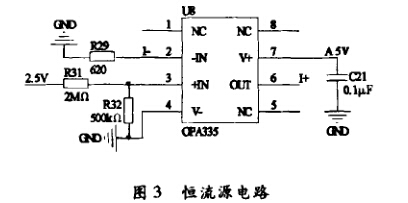 恒流源電路的核心芯片是OPA335,此芯片是 自動置零,單電源運(yùn)算放大器。具有最大5(|^的 失調(diào)電壓,285RA的靜態(tài)電流,同時滿足了系統(tǒng)高 精度和微功耗的要求。恒流源電路如圖3所示, 利用運(yùn)算放大器“虛短”和“虛斷”的特性設(shè)計(jì),其 中電阻R29、R31和R32均采用1%的高精密電 阻,產(chǎn)生806皡的恒流源,【+和I-分別是壓力 傳感器的正、負(fù)電源輸人端。經(jīng)測試,此恒流源在 負(fù)載阻抗低于5kO時,穩(wěn)定可靠,滿足本系統(tǒng)壓 力傳感器的供電要求。