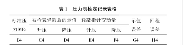 (6)規程附錄A“壓力表檢定記錄基本格式”的表格 在“回程誤差”列前增加“示值誤差”列,采用excel壓力表 數據自動處理模塊進行數據處理。