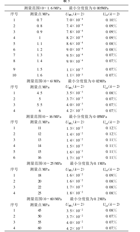 0. 25級精密壓力表是使用0. 05級活塞壓力計可校 準的最佳被校精密壓力表,因此該項目的CMC為:測量范圍(0 ~ 60)MPa: Ue/ = 0. 1 %