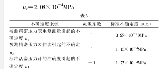 4. 3標準活塞壓力計的準確度引起的不確定度分量u3 由標準活塞壓力計的檢定證書得出:標準活塞壓力 計準確度等級為0. 05級,測量0. 6 MPa點時的允許誤差 為 ±0. 05%X 0. 6MPa =0. 0003MPa,即半寬度最大值《= 0. 0003 MPa依據壓力檢定系統表,包含因子k-J3,則標 準活塞壓力計所引入的不確定度分量為: u3 = c<//3=0. 0003/73= 1. 73X 10—4MPa