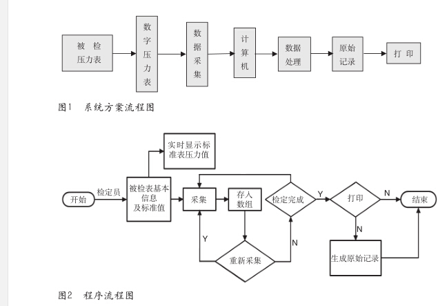 整個測量系統(tǒng)由硬件和軟件兩部 分組成,主要工作流程是利用數(shù)字壓力 校驗儀測量被檢壓力表加壓在檢定值時 的壓力值,通過RS-232數(shù)據(jù)采集設備將 檢定值傳輸至計算機,采用上位機程序 對所采集數(shù)據(jù)進行計算、分析和處理,根 據(jù)需要生成原始記錄并打印。系統(tǒng)方案 流程圖如圖1所示。