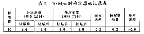 根據(jù)以上對估讀誤差的分析與確定,在lOMpa時,測定其結(jié)果并填 寫檢定原始記錄如表2所示。