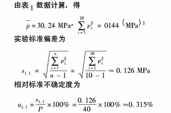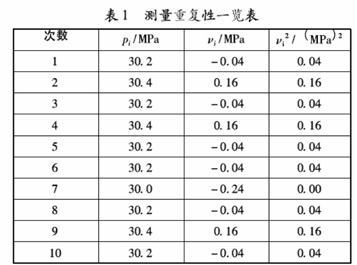 值誤差最大點(diǎn)30 Mpa,在該點(diǎn)重復(fù)測(cè)量10次,以該點(diǎn)的 測(cè)量重復(fù)性來(lái)估算其相對(duì)標(biāo)準(zhǔn)不確定度。如表1所示。