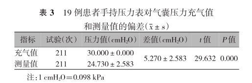手持壓力表測量氣囊壓力偏差的臨床研究結 果(表3):對研究對象累計進行211次測量,手持壓 力表對氣囊壓力充氣值和測量值存在偏差,差異有 統計學意義((=29.632,P=0.000)。