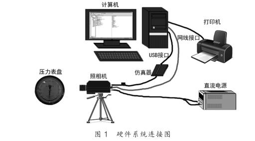 本系統的硬件連線圖如圖1所示。照相機由12 V直流電 源供電,拍照獲得壓力表盤圖像后,采用以太網接口通過網線與 計算機連接傳輸圖像, 計算機將采集圖像進行預處理后識別表 盤讀數,完成表盤重繪后再送給打印機打印輸出表盤。