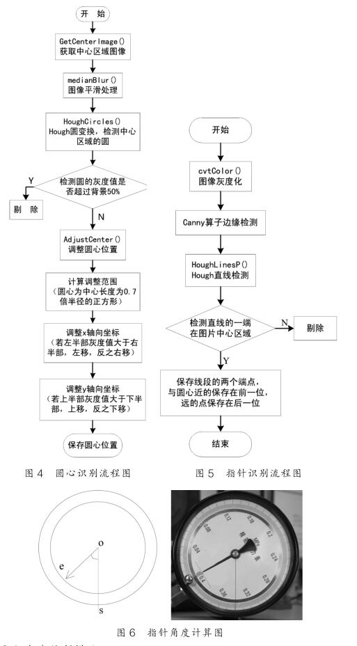 模式識別是本軟件最核心的模塊,主要包括了圓心識別、指 針識別以及指針角度計算三個部分,圓心識別主要利用Hough 圓變換,指針識別則首先利用Canny邊緣檢測算子檢測出圖像 的邊緣信息[2],然后用Hough直線檢測來提取識別指針直線。