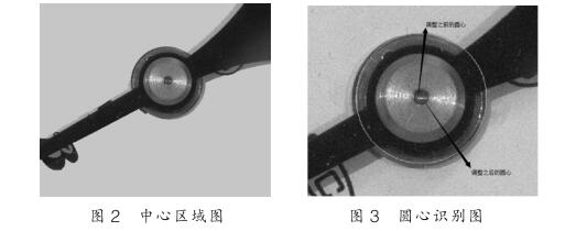 其中Hough圓變換首先獲取的中心區域如圖2所示,經過 Hough圓變換后得到圓心并進行調整后的圓心位置對比效果 如圖3所示。