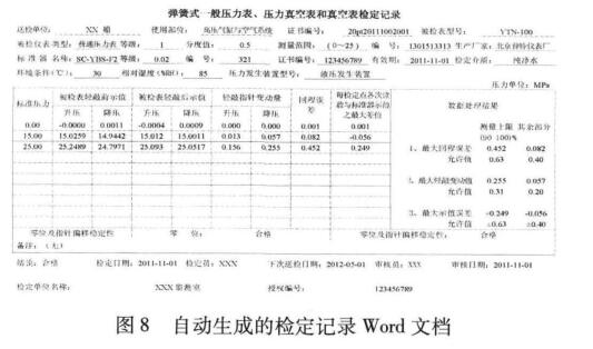③后續(xù)處理。針對軟件頁面中的操作部分,耑要 判斷零位、指針偏移穩(wěn)定性及外觀迠否合格,并自動給 出檢定結(jié)論,錄人核審人員及各種時間后點占保存數(shù) 據(jù)按鈕實現(xiàn)檢定數(shù)據(jù)的保存。圖7所示為儀表筲珂的檢定數(shù)據(jù)記錄與處理頁面,點擊打印報表按鈕即可打 印檢定記錄并生成檢定證書,如圖8所示。