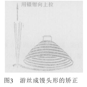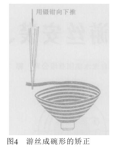 (1)安裝后游絲平面出現(xiàn)凹凸不 平,以鑷鉗垂直夾于尾端根部,成饅 頭形,鑷鉗往上拎;成碗形,鑷鉗往下 壓,一般都能調(diào)好。調(diào)修的方法如圖 3、圖4所示。如僅外端尾部一小段超 離平面,采用剪去的辦法。