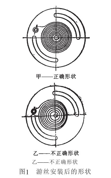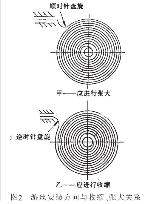 4.壓力表游絲的安裝與拆卸 其方向有兩種,按張大游絲的方 向安裝,其游絲的作用力大,指針緊靠 表盤限止釘。按收縮游絲的方向安裝, 其游絲的作用力平穩(wěn)(如圖2所示)。此 外,在安裝與拆卸時要注意以下幾點(diǎn):