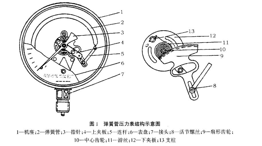 彈簧管壓力表的結構及工作原理如圖1 示。彈簧管2與接頭7相通,當壓力從接頭7引人彈簧管后,彈簧管的截面積由橢圓趨向圓形變 化,同時彈簧管彎度變小,管子略為伸直,自由端 產生位移。此位移通過由拉桿5、扇形齒輪9 中心齒輪10組成的傳動機構轉變成中心齒輪軸 的轉動,帶動裝在齒輪軸t指針3轉動,于是可以 從表盤6上讀出壓力值。中心齒輪10下端裝有 游絲11,游絲一頭固定在中心齒輪軸上,另一頭 固定在上下兩夾板4和12間支柱13處,游絲的 作用是消除中心齒輪與扇形齒輪嚙合時的間隙和 被測壓力消除后使指針回到零位。