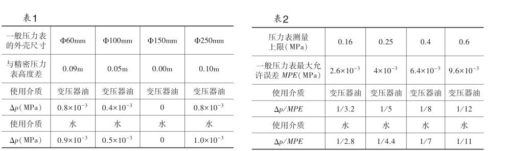 壓力表檢定中,常使用油、水、空氣作為介質(zhì) 來(lái)傳遞壓力,對(duì)壓力表進(jìn)行檢定。油、水、空氣等統(tǒng) 稱為流體。如圖1所示,在一般壓力表檢定過(guò)程中, 由于一般壓力表的外売尺寸不同,造成被檢壓力表 與精密壓力表中心軸不在同一高度,即兩者之間存 在高度差。若設(shè)處于較高位置的壓力表處的壓力為 p0則處于較低位置的壓力表處的壓力為p =p0+pgh 檢定壓力表時(shí),隨著檢定壓力增加xp,則基本方程變 p +xp = (p0+xp ) +pgh。因而測(cè)量高度差的存在在檢定 過(guò)程中始終會(huì)對(duì)檢定結(jié)果帶來(lái)一定的影響。這種影 響,隨著壓力表測(cè)量上限的降低而增大,隨著一般壓力表與精密壓力表兩者外売尺寸相差增加而增大。目 前,一般壓力表的外売尺寸常見的有$60mm $100mm$150mm$250mm精密壓力表的外売尺寸 一般為^ 150mm,大多數(shù)企業(yè)在檢定壓力表時(shí),通常 配備“壓力表/氧氣表兩用校驗(yàn)儀”“壓力表校驗(yàn) 儀”,這些儀器常用的工作介質(zhì)為變壓器油20°C時(shí), p=0.86x103kg/m3)和水(20°C 時(shí)p=1x103kg/m3)。在壓力 表檢定過(guò)程中,只讀取被檢壓力表與精密壓力表的示 值差,而忽略了被檢壓力表與精密壓力表因高度不同 帶來(lái)的附加誤差。有些單位在使用油為介質(zhì)的壓力表 校驗(yàn)儀上安裝油水隔離器檢定氧氣壓力表,這也會(huì)加 大被檢壓力表與精密壓力表的高度差,帶來(lái)更大的附 加誤差。因高度不同帶來(lái)的誤差計(jì)算公式為Ap =pgh (式中:p——液體密度;g——當(dāng)?shù)刂亓铀俣?h—— 被檢壓力表與精密壓力表高度差),當(dāng)高度差的存在 對(duì)檢定結(jié)果的影響不能忽略不計(jì)時(shí),就要對(duì)檢定結(jié)果 進(jìn)行修正。處于較高位置的壓力表示值加上Ap才能 與處于較低處壓力表實(shí)際壓力相等。下面,用表格的形式(見表1)對(duì)不同外売尺寸的被檢壓力表與精密壓 力表高度差對(duì)檢定結(jié)果的影響進(jìn)行分析,來(lái)確定高度 差對(duì)檢定結(jié)果的影響程度(徐州重力加速度g= 9.7967m/s2)