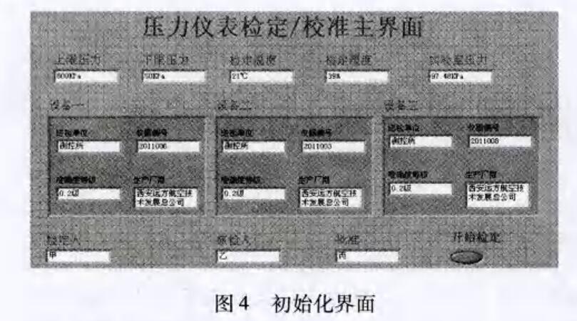 該模塊主要用于在系統開始運行時進行串口配置, 并對該軟件進行自檢。同時提示用戶輸人待校準設備 的名稱、型號規格、生產廠家、出廠編號、量程、準 確度、校準日期和環境溫濕度以及客戶名稱。并且根 據準確度要求設定校準點個數,根據量程設定測量范 圍的上下限并選擇校準單位。初始化界面如圖4所示。