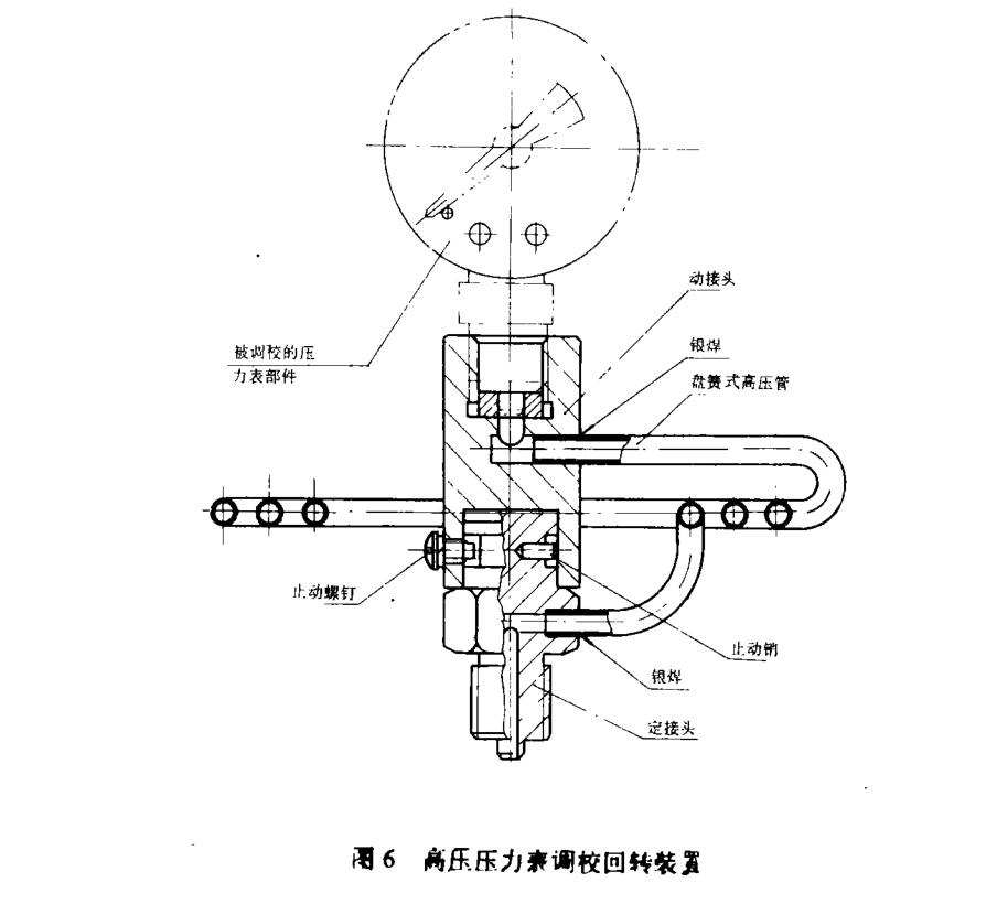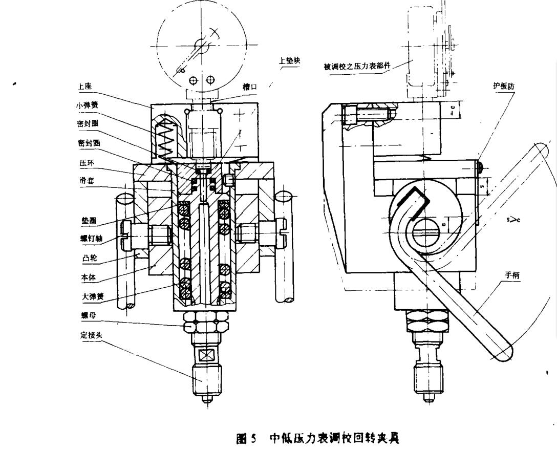 但是,反裝式機(jī)芯結(jié)構(gòu)的壓力衣也沿調(diào)忪沿來(lái)了一^H題.調(diào)校人員耍站起來(lái)跑到 壓力表/fun調(diào)整后又轉(zhuǎn)回來(lái).i了解決這一m R,我們研制了一套在調(diào)校時(shí)能將壓力表旋轉(zhuǎn) 180 °的裝置(見(jiàn)圖5).為了使調(diào)校時(shí)產(chǎn)品能 快速裝夾與卸下來(lái),壓力表接頭設(shè)有一環(huán)形 槽,安上校驗(yàn)裝置時(shí),只需將接頭的槽口卡入 上座上的內(nèi)凸鍵上,再將彎曲手柄向下壓,通 過(guò)兩邊的凸輪將壓環(huán)向上頂,經(jīng)過(guò)滑套借助于 大彈簧的力量將放在上塑塊中的密封圈緊壓在 壓力表接頭底面板上。橫向推動(dòng)手柄便可作任 意角度的水平旋轉(zhuǎn).該裝置缺點(diǎn)是要求壓力表 接頭小端面要平滑,壓力過(guò)高時(shí)不適用.圖6 是專為最高測(cè)量壓力為6MPa以上的壓力表 校驗(yàn)吋用的回轉(zhuǎn)於置。采用了盤(pán)形彈簧式的金 屬管,兩端分別與定接頭和動(dòng)接頭焊接,避免 了密封問(wèn)題.缺點(diǎn)是裝置的橫向尺寸較大.圖 5裝置在校驗(yàn)時(shí)壓力表要作輕敲位移檢查,此 時(shí)壓力表外殼沒(méi)有安上,只能用手指敲擊接頭 部分.試驗(yàn)表明,這與壓力表出廠檢驗(yàn)時(shí)輕敲 外殼無(wú)甚差別.