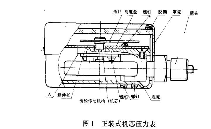 為了降低產(chǎn)品的成本,人們常在制造技術(shù) 及工藝裝備上做文聿.可降低成本的關(guān)鍵主要 在于設(shè)計(jì),卻被人們所忽視。長(zhǎng)期以來(lái),我國(guó) 許多儀表廠生產(chǎn)的C形彈簧管式一般壓力 表,產(chǎn)品結(jié)構(gòu)大體相同,齒輪傳動(dòng)機(jī)構(gòu)(以下 簡(jiǎn)稱機(jī)芯)的安裝方式基本一樣。如圖1所 示,機(jī)芯的底板,在平面A處固定在接頭的 延伸平板上,謂之機(jī)芯正裝式。而近年來(lái)進(jìn)口 的歐美國(guó)家的產(chǎn)品,絕大部分是機(jī)芯反裝式 的:機(jī)芯底版朝上,,直接固定在接頭的上平面 上;他們的機(jī)芯普遍比我國(guó)生產(chǎn)的輕、薄、 小.正裝式壓力表除了體重、費(fèi)材料之外,還 在于產(chǎn)品生產(chǎn)過(guò)程中,調(diào)校安裝太費(fèi)時(shí)間,表 接頭機(jī)械加工工序考。我們近年來(lái)與國(guó)外一聾 先進(jìn)廠家,如英國(guó)6<J波登BOURDON公司等 的專家進(jìn)行多次技術(shù)交流,從而得知:他們的 產(chǎn)品結(jié)構(gòu)設(shè)計(jì)能為高生產(chǎn)效率創(chuàng)造良好的先決 條件,產(chǎn)品設(shè)計(jì)除了考慮性能外,還密切地與 先進(jìn)的工藝裝備相配合.有專門(mén)的廠家供應(yīng)數(shù) 十米長(zhǎng)的按照壓力表設(shè)計(jì)的彈簧管卷材,便于 機(jī)械化與自動(dòng)化彎管、焊接,對(duì)于一定規(guī)鋒的 壓力表,他們的管材,從機(jī)械性能到形狀與尺 寸,都控制得很穩(wěn)定,因此在調(diào)校壓力表時(shí), 不但工作量小,而且很有規(guī)律,機(jī)芯底版不用 圍繞小齒輪.軸線旋轉(zhuǎn),用以調(diào)整指針角位移與 彈簧管管端位移的線性誤差.從而能使反裝式機(jī)芯底版可以直接固定在接頭上。