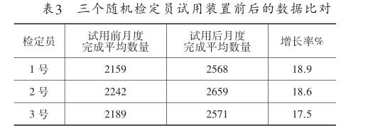 從表3可看出,選擇的三個檢定員試用前后月度 完成數量增長率在18%左右。雖然因個體差異和其他 不確定因素,這個平均數據也存在很大的不確定性, 但個人數據的趨勢也是增長狀態,故有一定的可信