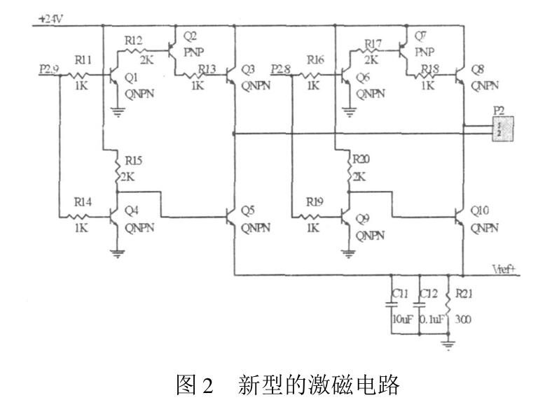 為此,設(shè)計(jì)了一個(gè)新型的激磁電路,并將激勵(lì)電流 反饋到A/D轉(zhuǎn)換器以消除激勵(lì)電流不穩(wěn)定對(duì)A/D 轉(zhuǎn)換結(jié)果的影響,如圖2。