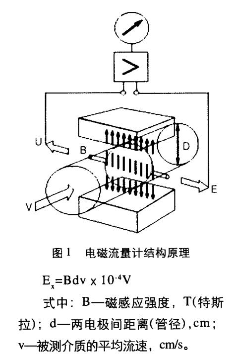 電磁流量計由變送器和轉換器兩 部分組成,兩者之間用連接線(包括勵 磁線、信號線)相互連接。變送器是基 于電磁感應定律工作的,如圖1 示,被測介質垂直于磁力線方向流 動,因而在于介質流動和磁力線都垂 直的方向上產生一感應電動。