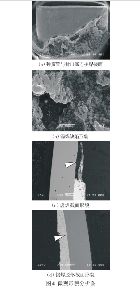將該壓力表彈簧管脫落端在掃描電子顯微鏡 下進行微觀形貌與元素分析,觀察到焊接區(qū)域焊料 鋪展不均勻,彈簧管焊接部分靠近端面處有大片區(qū) 域沒有焊錫,如圖4(a)和(b)所示。切取彈簧管焊 接截面,觀察到彈簧管表面有部分虛焊段及焊接脫 落段,如圖4(c)和(d)所示。焊接接頭存在裂紋、夾 渣、氣孔等缺陷,對接頭的靜力學性能的影響一般 不明顯,但是對焊接結(jié)構(gòu)的疲勞性能影響卻十分顯 著。壓力表彈簧管在工作時受到波動壓力的作 用,焊接缺陷就會引發(fā)彈簧管的疲勞失效。